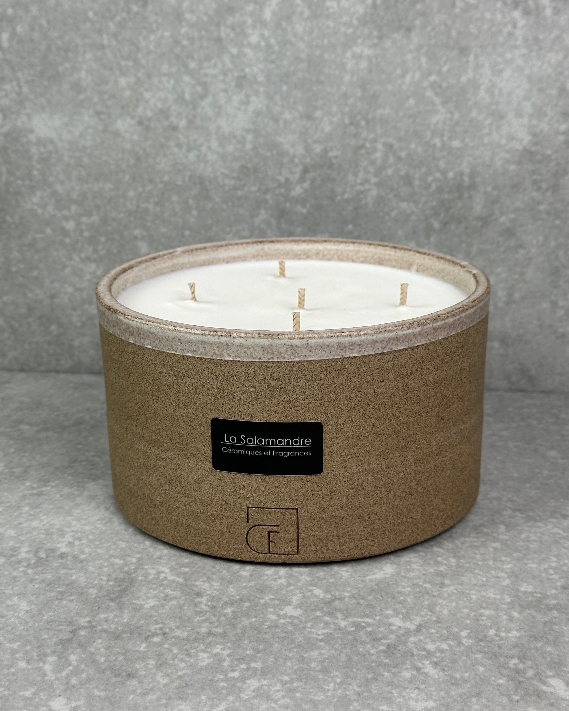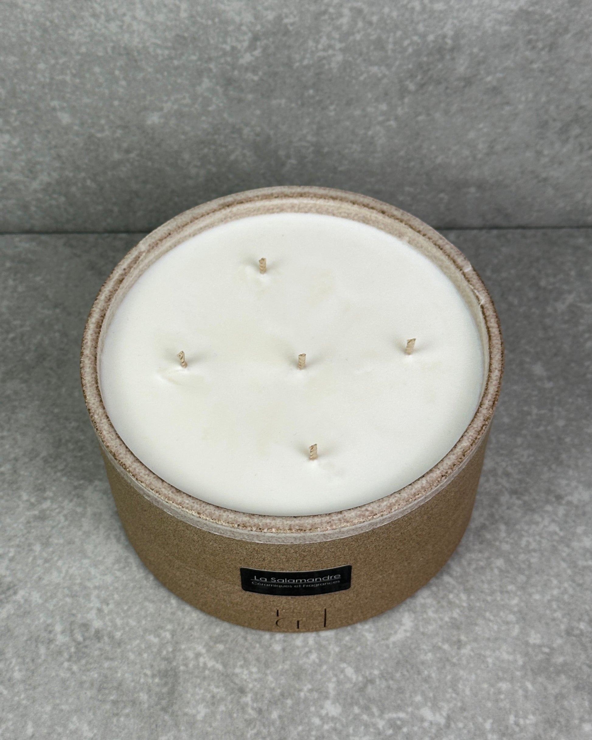 Création artisanale. Fabriquée à partir de céramique, cette bougie est composée de 5 mèches en coton et d'une cire végétale européenne 100% naturelle. Fragrance au Bois de Santal.