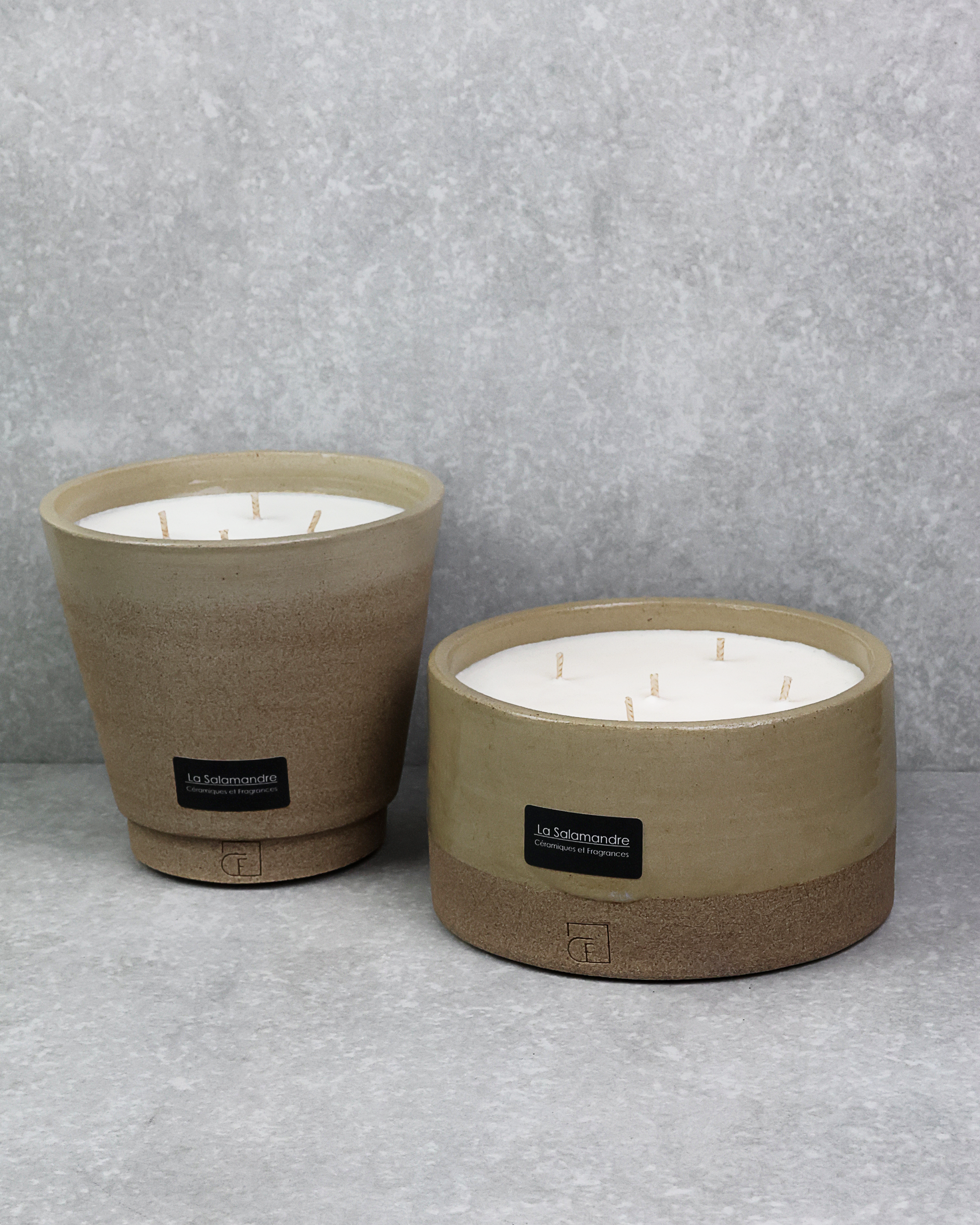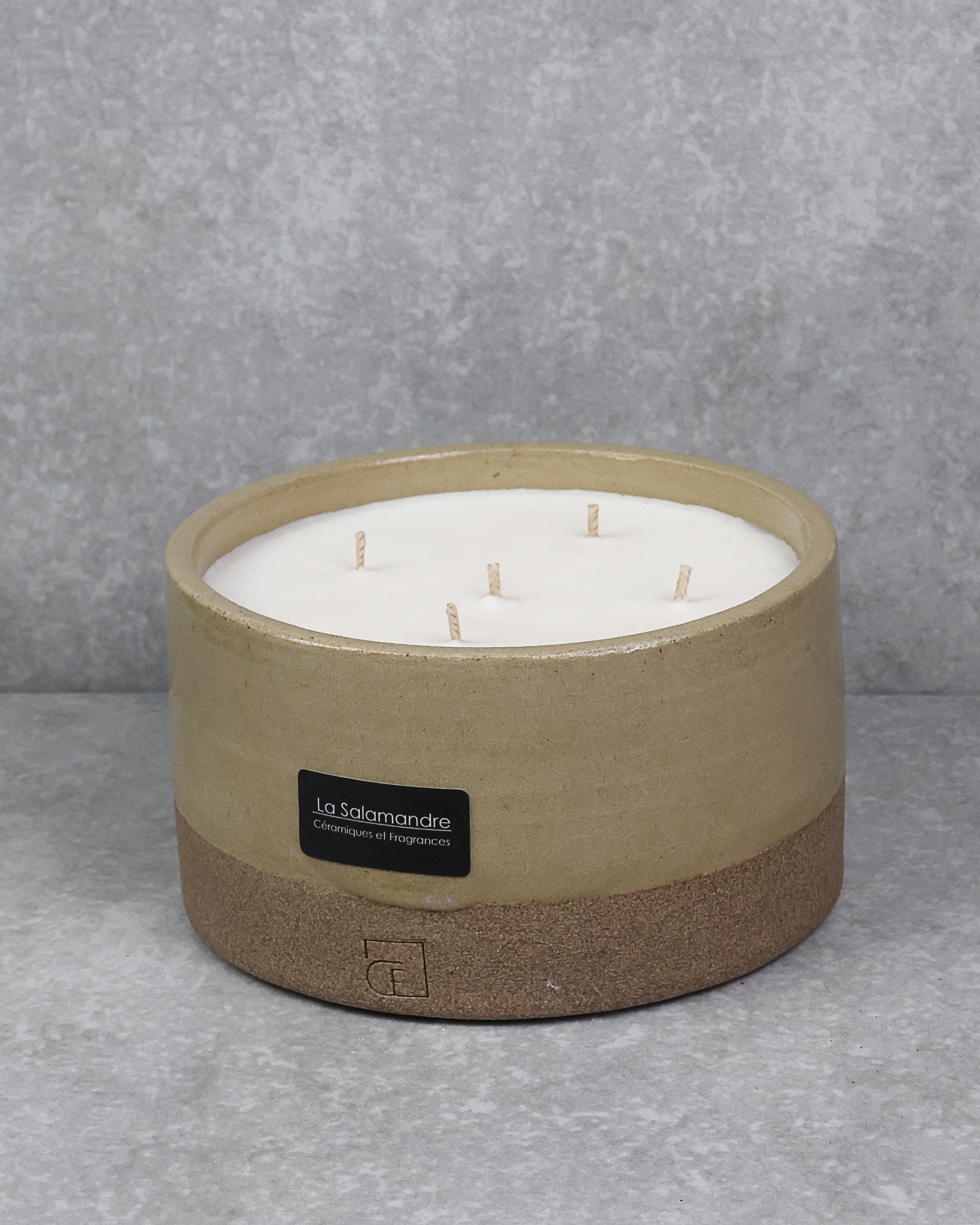 Création artisanale. Fabriquée à partir de céramique, cette bougie est composée de 5 mèches en coton et d'une cire végétale européenne 100% naturelle. Fragrance au Bois de Santal.